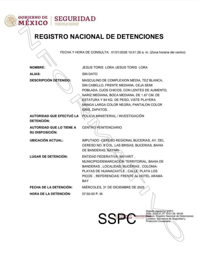 BAHÍA TIMES, Tepic, Nayarit.- Las noche de este miércoles en las playas de la localidad de Bucerías, municipio de Bahía de Banderas, fue detenido Jesús Toris Lora por elementos de la Fiscalía General de Nayarit.